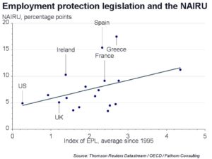 So much for the theory, what do the data tell us? In fact, they are quite supportive. Our chart compares an OECD index of employment protection legislation (EPL), which ranges from ‘0’ for the least restrictive through to ‘6’ for the most restrictive, with that same organisation’s estimate of the NAIRU in 18 major economies[2]. The correlation between these two series is 0.4, suggesting that higher levels of EPL do indeed tend to be associated with a higher rate of unemployment in steady state, though the relationship, unsurprisingly, is imperfect. Other factors are at work.