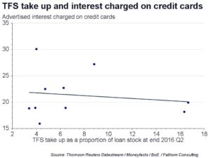 The interest charged on personal loans has decreased, and the Bank reports that the terms on credit cards have become increasingly favourable, such as extended interest free periods. There is also some evidence that banks with the greatest uptake of the scheme tend to offer lower interest rates than their peers, as illustrated by the charts below. Metro Bank is an exception to the rule, perhaps because its clientele is different to the norm and arguably riskier.