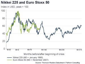 What is worse, many of these ‘recoveries’ in equity prices have really just reflected currency movements. As our second chart shows, in US dollar terms the performance of the Eurostoxx 50 is alarmingly similar to that of the Nikkei 225. If history is repeating itself, in dollar terms, the Eurostoxx 50 is looking at another decade of see-sawing around a flat line.