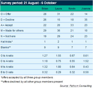 When I joined Fathom, making a drink could turn into an ordeal. I could barely remember everybody’s name never mind how much milk, or how many sugars, they liked in their tea. The prospect of making up to 17 drinks ultimately changed my behaviour and presumably that of my colleagues, too. There were many ways to game the system: get to work before most people arrived and make your drinks then; pick up a latte on the way to work; wait for somebody else to offer you a drink even though you really want one now; offer to make a drink straight after somebody else has made a drink to give the appearance that you offer every now and then; make a scene every time when you offer a drink so people remember it, creating the impression that you offer more than you actually do; eat lunch at your desk, but pop out for a cheeky espresso afterwards; take the passive-aggressive approach – i.e. offer drinks in a really hurried voice in the hope that the person receiving the offer senses your anxiety, feels sorry for you and says no, or simply doesn’t have enough time to decide if they want a drink before you walk off.