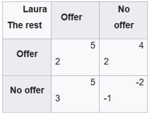 But what if Laura didn’t like making drinks so much? Such situations do not always lead to such optimal outcomes, and we are not all lucky enough to have a Laura sitting next to us. What if Laura didn’t like drinks any more than we did? A drink standoff could ensue. We may even feel guilty and decide to help Laura with the drinks from time to time – how might that change the payoff?