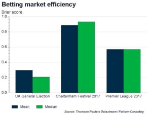 To evaluate the effectiveness of betting markets in predicting the outcome of each event, a Brier score is calculated. A Brier score compares implied probabilities and outcomes and penalises inaccuracy, i.e. occasions where either an outsider is successful or a favourite is beaten. The calculation is:
