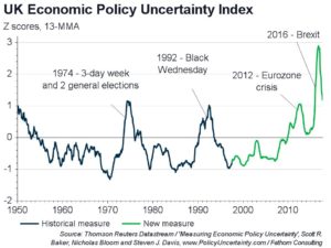 The distinction between the two concepts can be seen in the measures developed to examine uncertainty. The Economic Policy Uncertainty (EPU) Index of Baker et al. is a long-run series based on the share of newspaper articles published that month that mention ‘uncertainty’, the economy, and one or more of the terms ‘tax’, ‘policy’, ‘regulation’, ‘spending’, ‘deficit’, ‘budget’, ‘Bank of England’, ‘war’, and ‘tariff’.