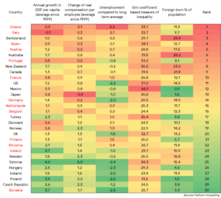 We have attempted to quantify the vulnerability to authoritarianism across countries, looking at a variety of different metrics that might capture or lead to a sense of dissatisfaction in the electorate – a sense of unfairness around the current political settlement. The results, in rank order, are shown in the table below.