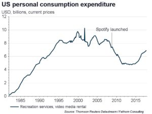 There may be other intangible benefits of owning a Taylor Swift album, such as the feelgood factor from having a CD with a picture of Taylor Swift on the cover, or listening to one of her songs. (No one at Fathom admitted to owning the latest Taylor Swift CD – one Fathom employee got visibly annoyed when I asked.) But these benefits are essentially non-market and cannot be expected to be captured by official output, or productivity, data. There could be issues related to hedonic adjustment of digital services such as music streaming – that is, adjustment in price indices to reflect improving quality – but such a discussion is beyond the scope of a Friday afternoon blogpost. We’ll be publishing more research on the impact that technological change has on the economy in due course.
