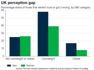 Just one more chocolate won’t make that much difference, right? Problematically, 43% of the adults deemed medically overweight by the Health Survey for England believed that they were “about the right weight” when questioned. As our chart highlights, that perception-reality gap was larger for men than women, with 58% underestimating or unsure of the problem, versus just 39% of women. Women were also more likely to be “trying to lose weight”, even though a higher proportion of men surveyed were overweight or obese.