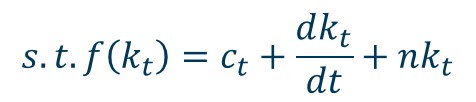 In the above, u(ct) is instantaneous utility (or ‘happiness’), which is assumed to be an increasing function of consumption per capita. It is then discounted at a rate θ to obtain the present value of expected future utility, U0. A benign central planner is then assumed to maximise U0 subject to the all-important constraint, representing the trade-off described above, which says that output (an increasing function of the capital stock per head, kt) is either invested, and used to raise the future capital stock, or it’s consumed.