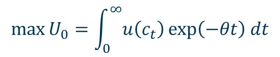 In his ‘A mathematical theory of saving’, Cambridge mathematician Frank Ramsey set out to derive a rule for the level of consumption that would maximise the present value of an individual’s expected future happiness.[2] Formally, he obtained a solution to the problem: